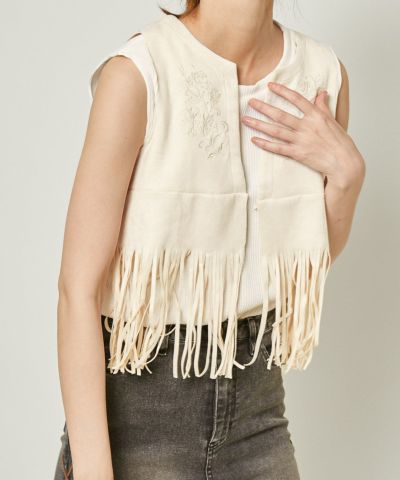 《ヴィンテージムード×個性派フリンジ》主役級スエード刺繍ベストのレビューを書く