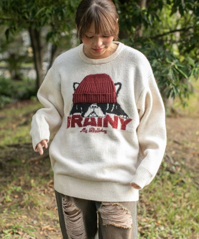 《立体ニット帽×ブルドッグ》レディース ジャカード ニットプルオーバー キャラクター 秋冬のレビューを書く