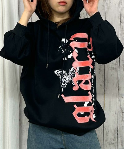 《ベロアロゴ×バタフライ》レディース 裏起毛 パーカー ビッグシルエット ストリート 秋冬のレビューを書く