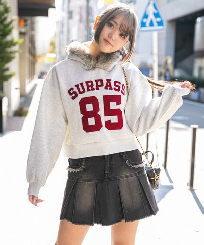 《ファーフード×ツイル貼付けロゴ》ショート丈裏起毛パーカー 秋冬◎のレビューを書く