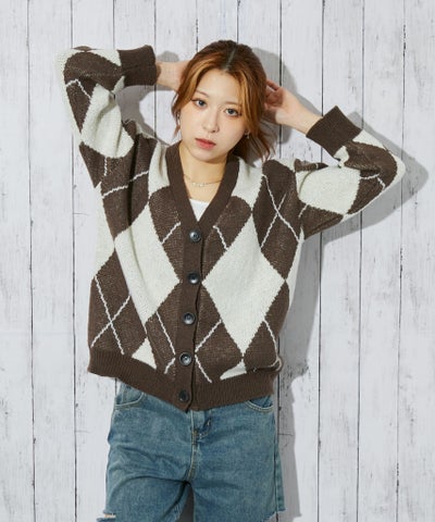 《大柄アーガイル×ゆるシルエット》レディース ニットカーディガン レトロ 秋冬のレビューを書く