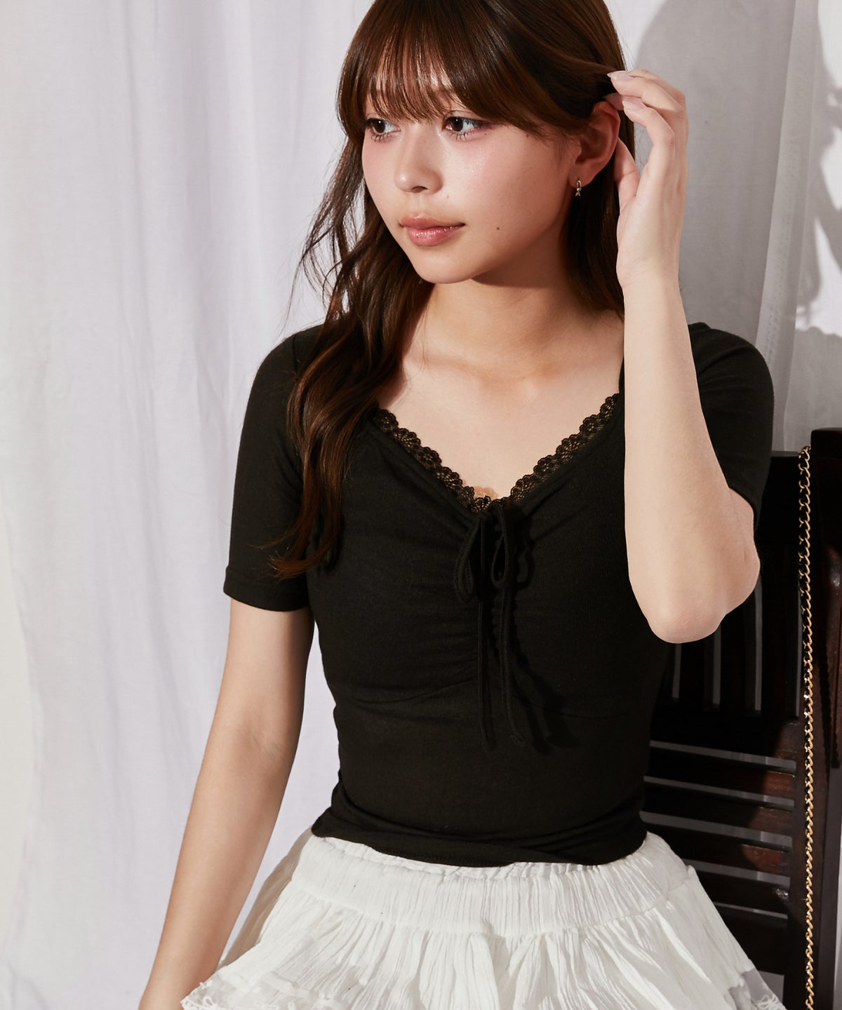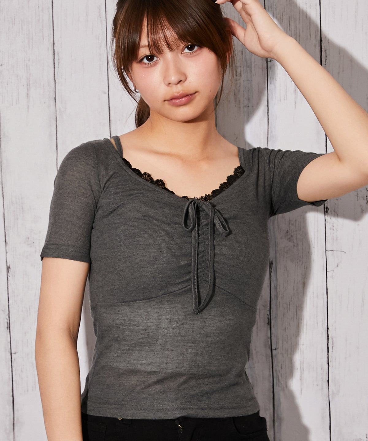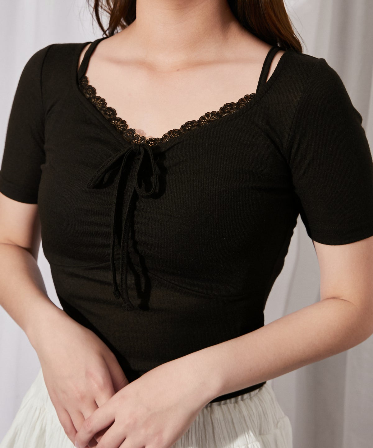 《フロントギャザー×レースレイヤード》カットソー/Y2K/フェミニン/春夏/全3色