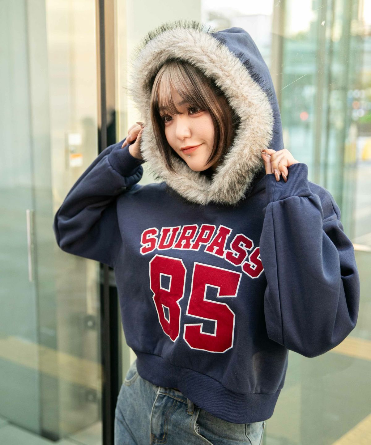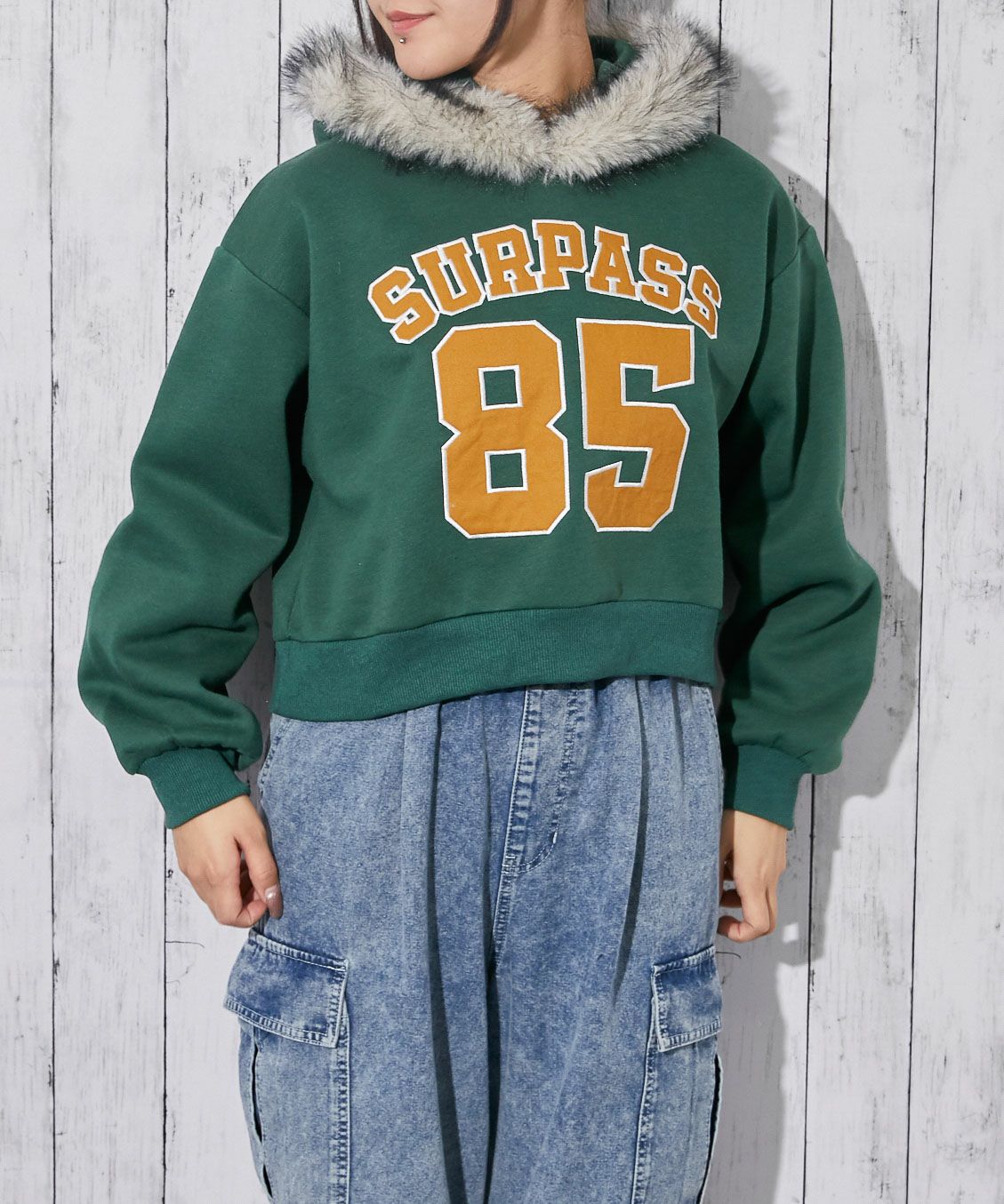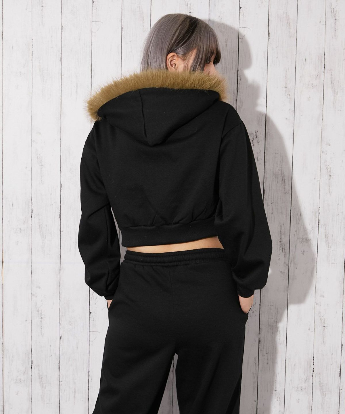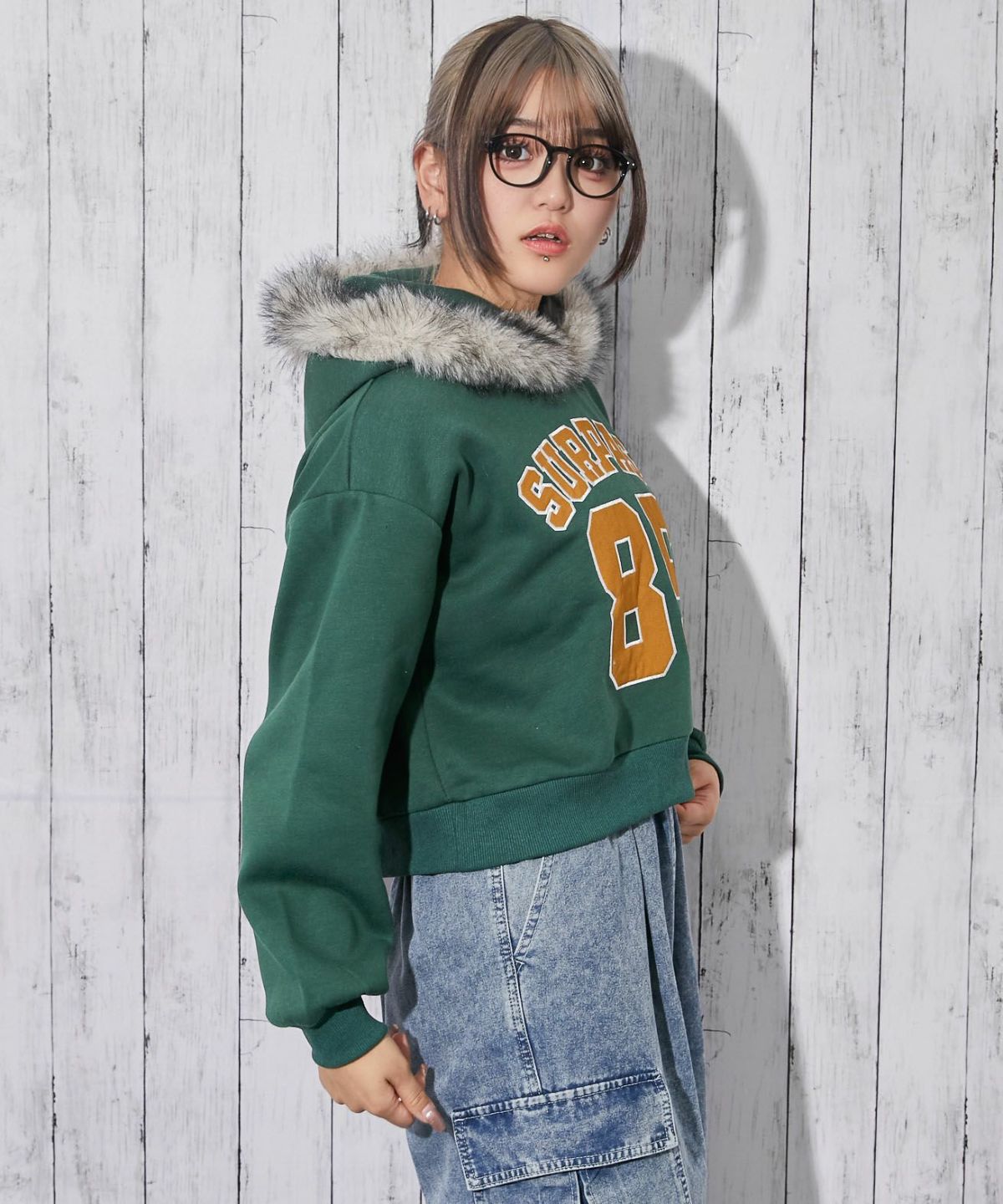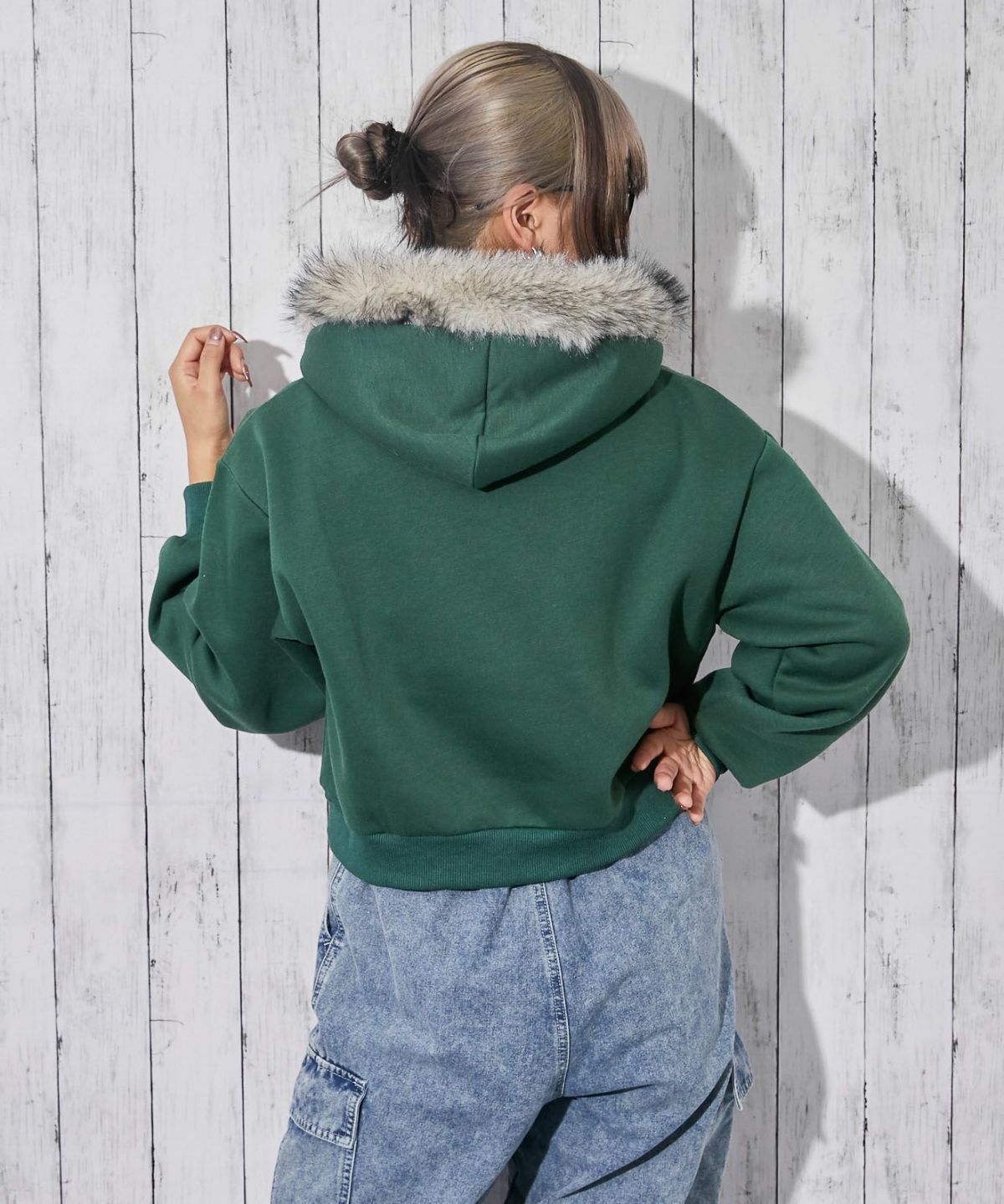 《ファーフード×ツイル貼付けロゴ》ショート丈裏起毛パーカー 秋冬◎