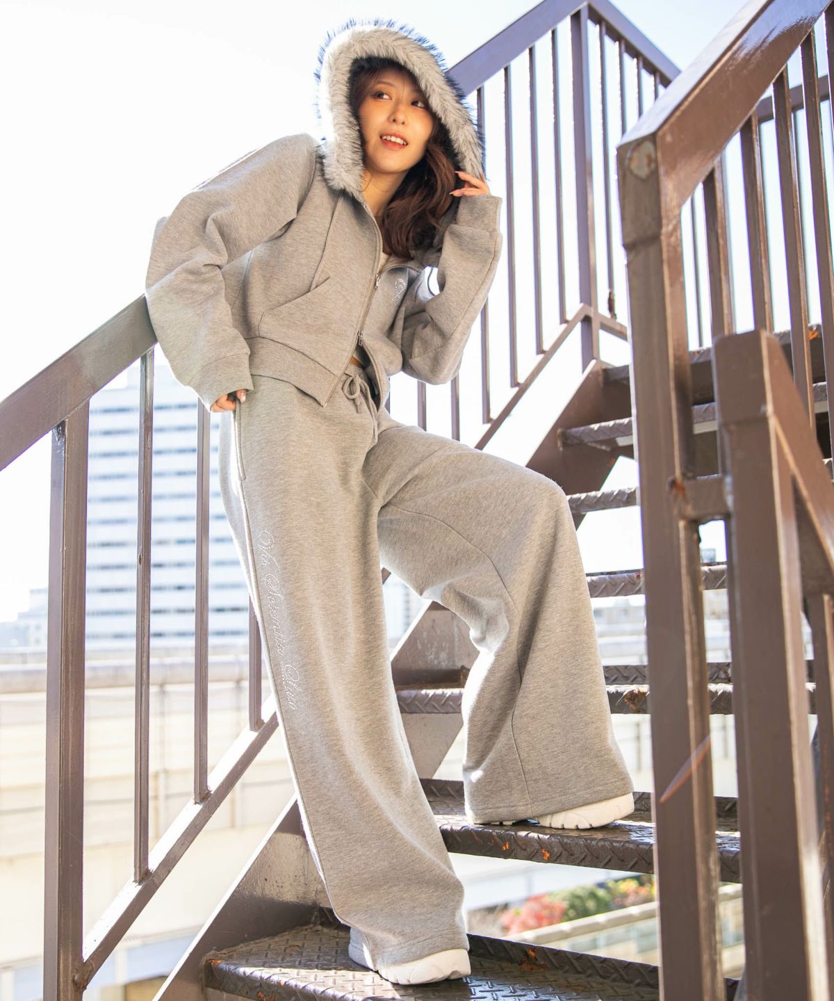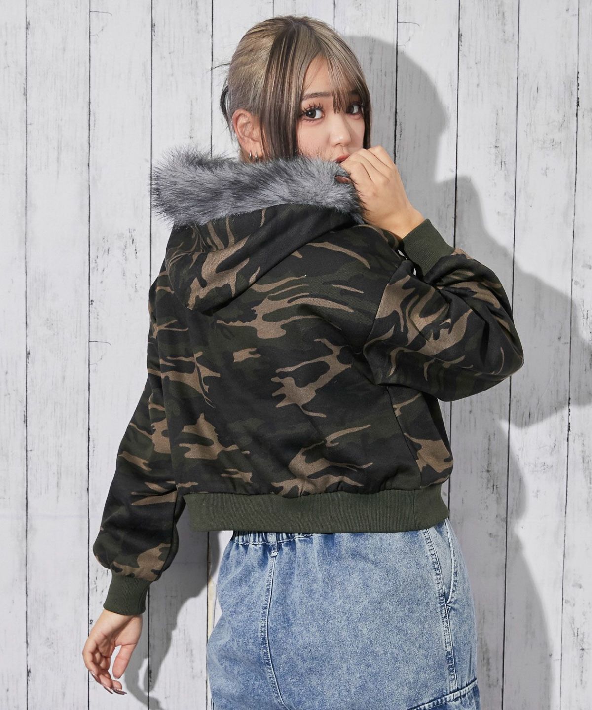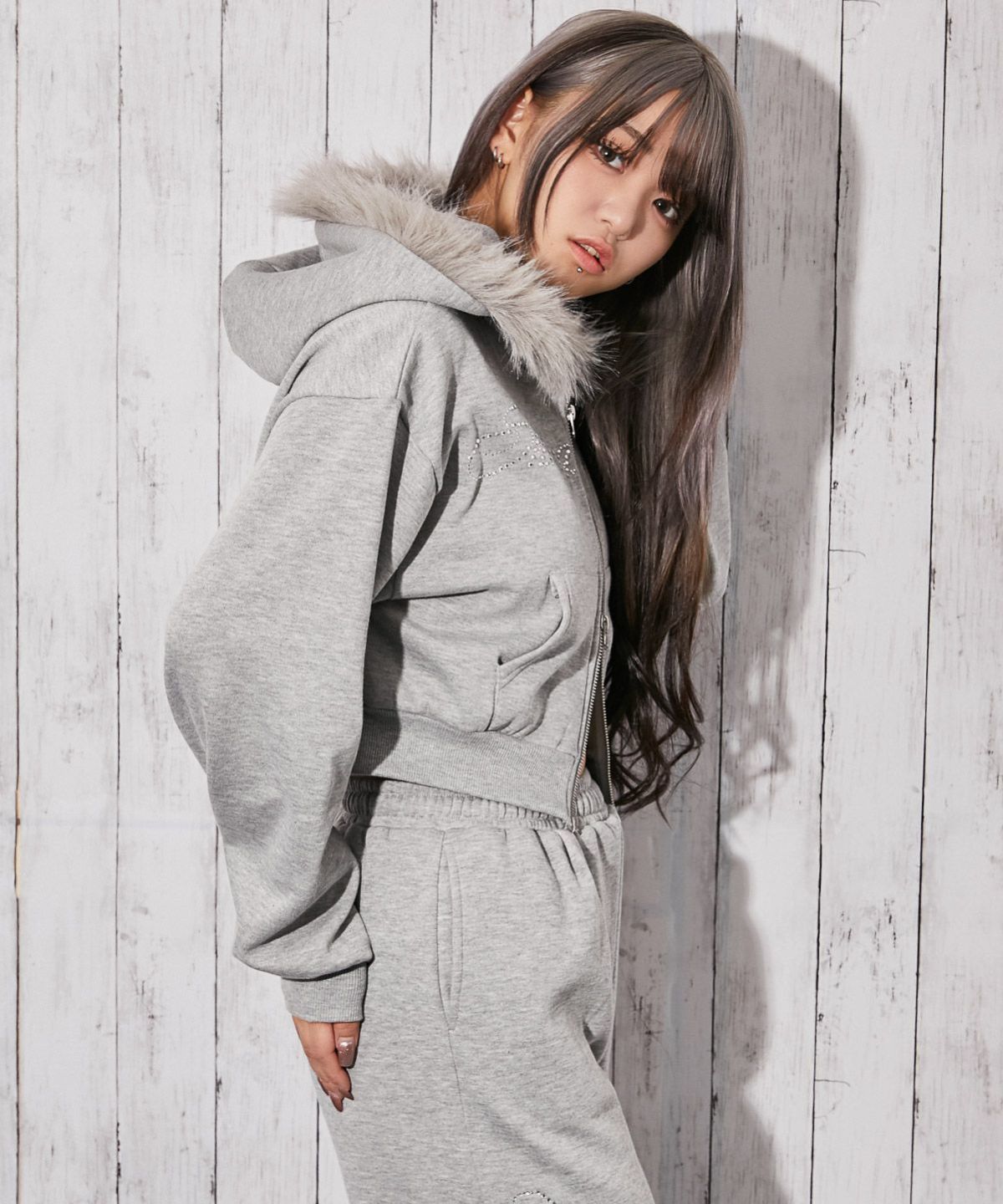 《ファーフード×ロゴストーン》ショート丈ジップパーカー 秋冬◎