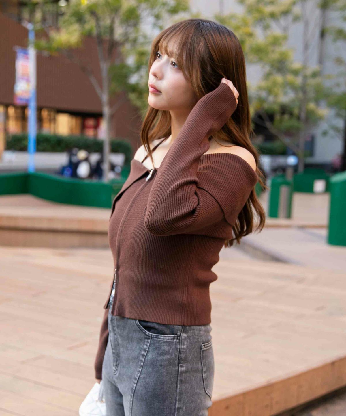 《デカ襟×ダブルジップ》大人可愛いリブトップス カーディガン