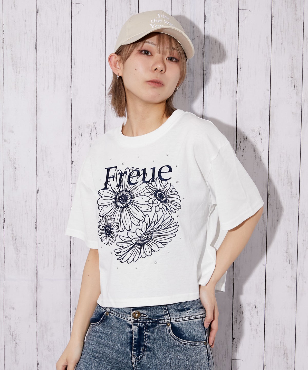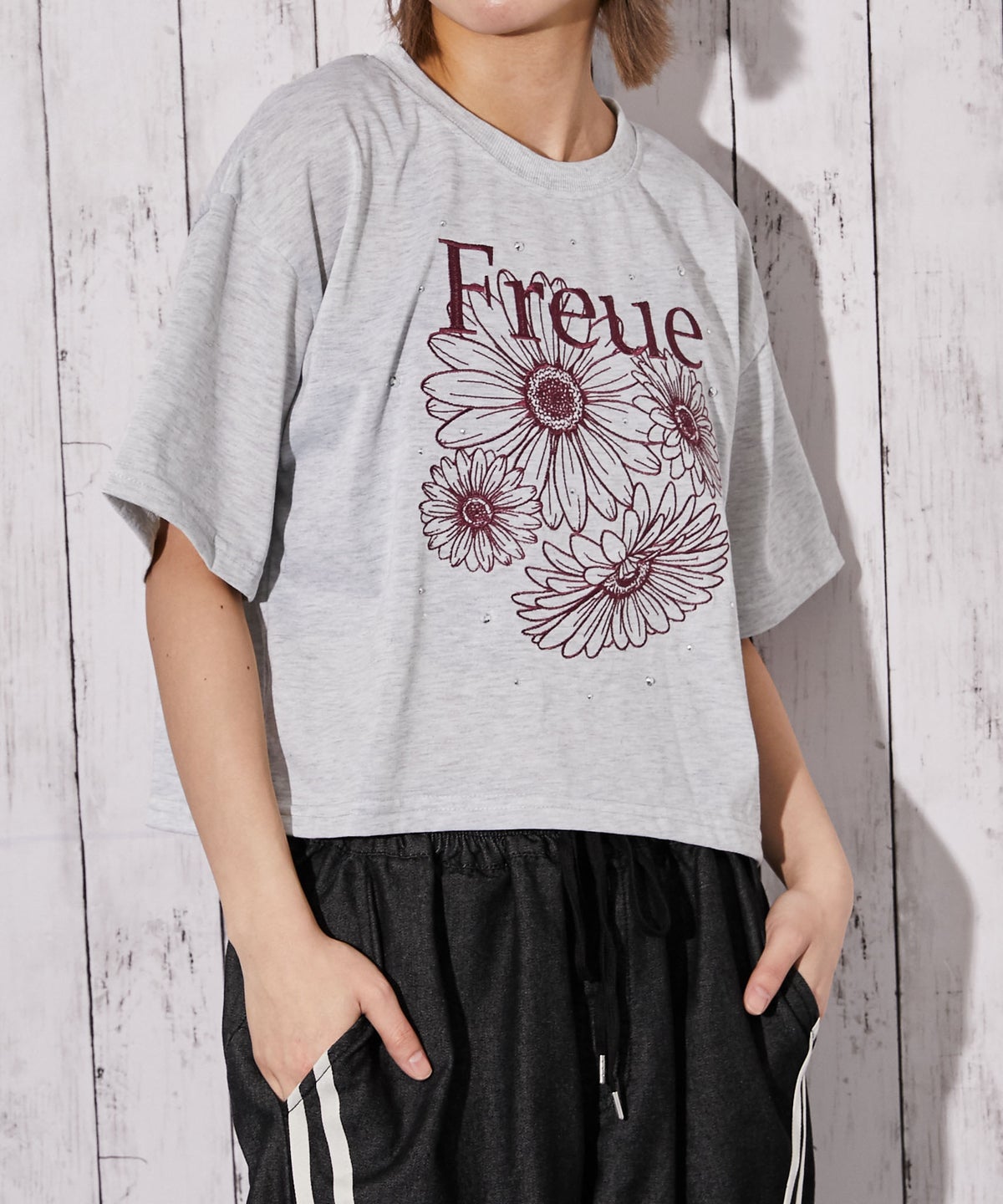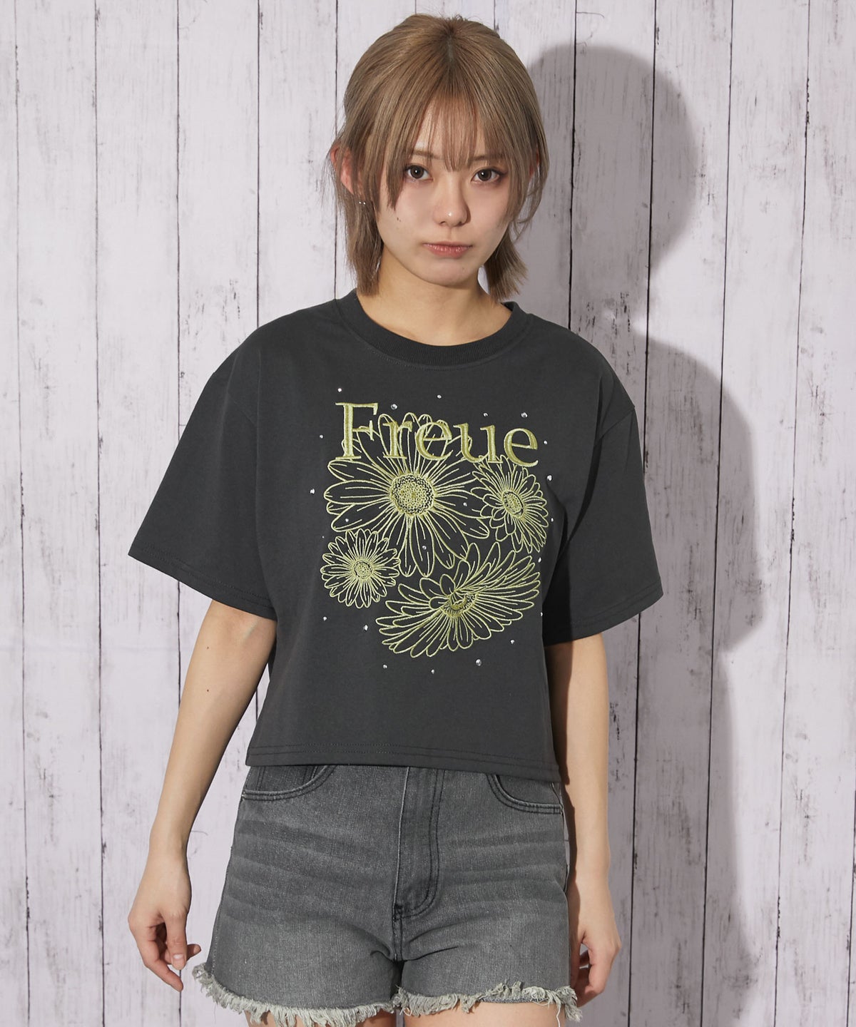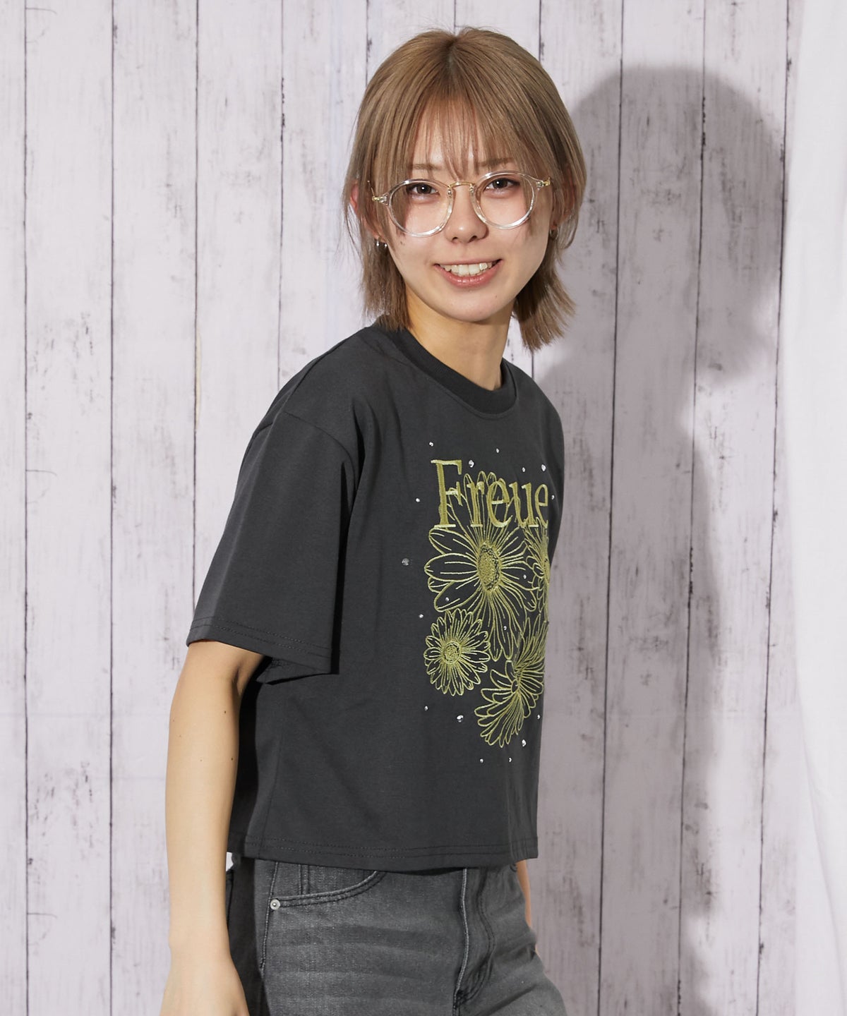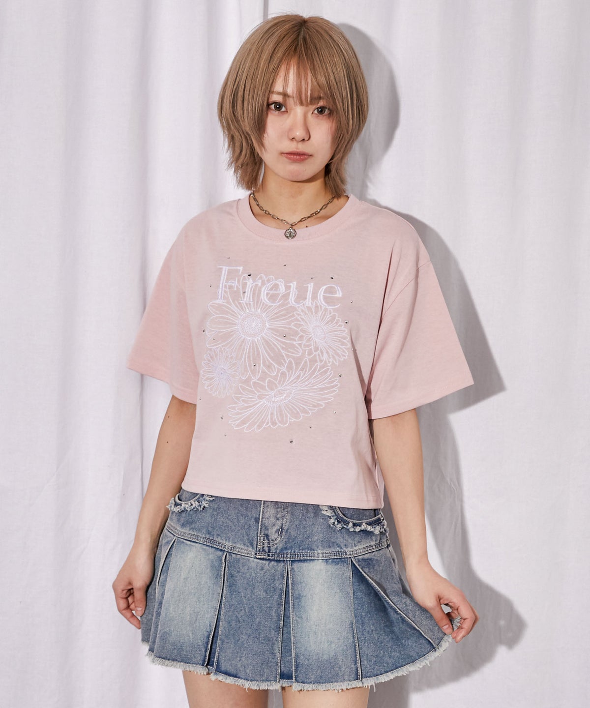 《花柄刺繍×ラインストーン》短丈Tシャツ/Y2K/春夏/全4色