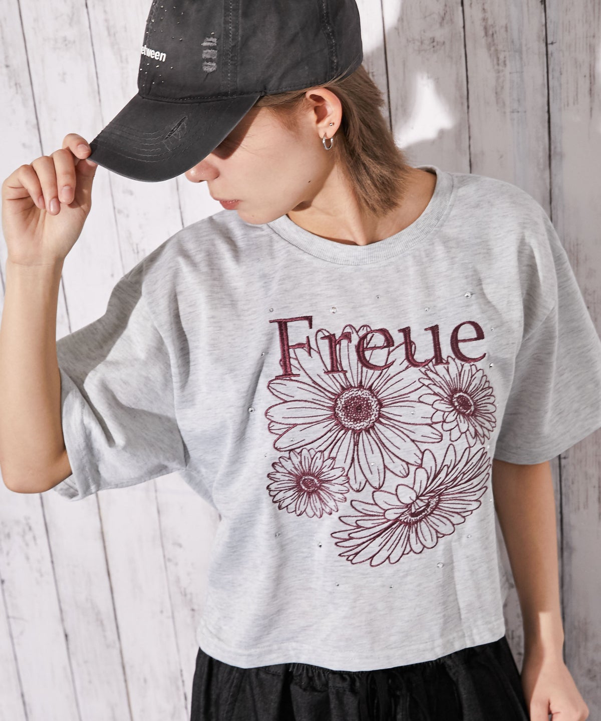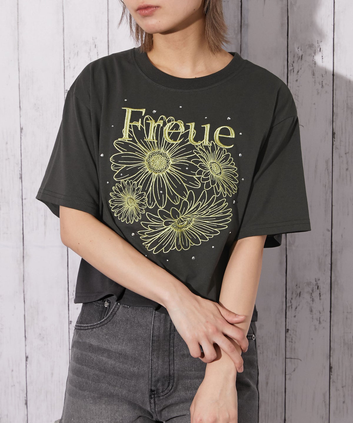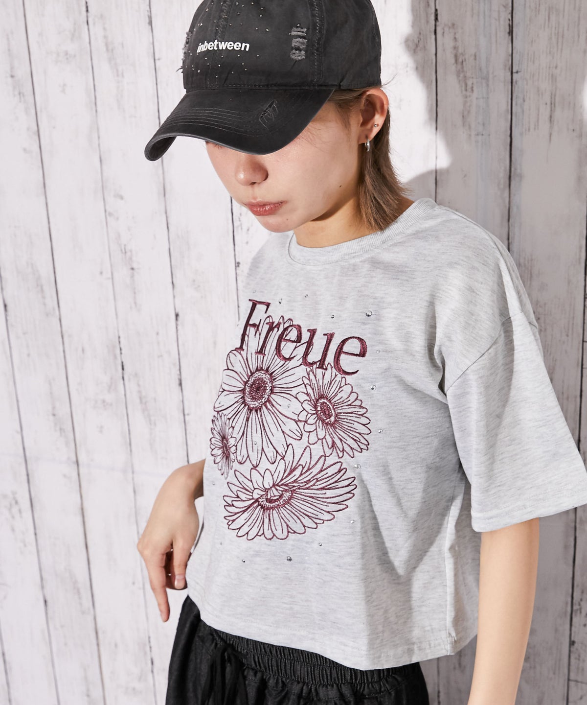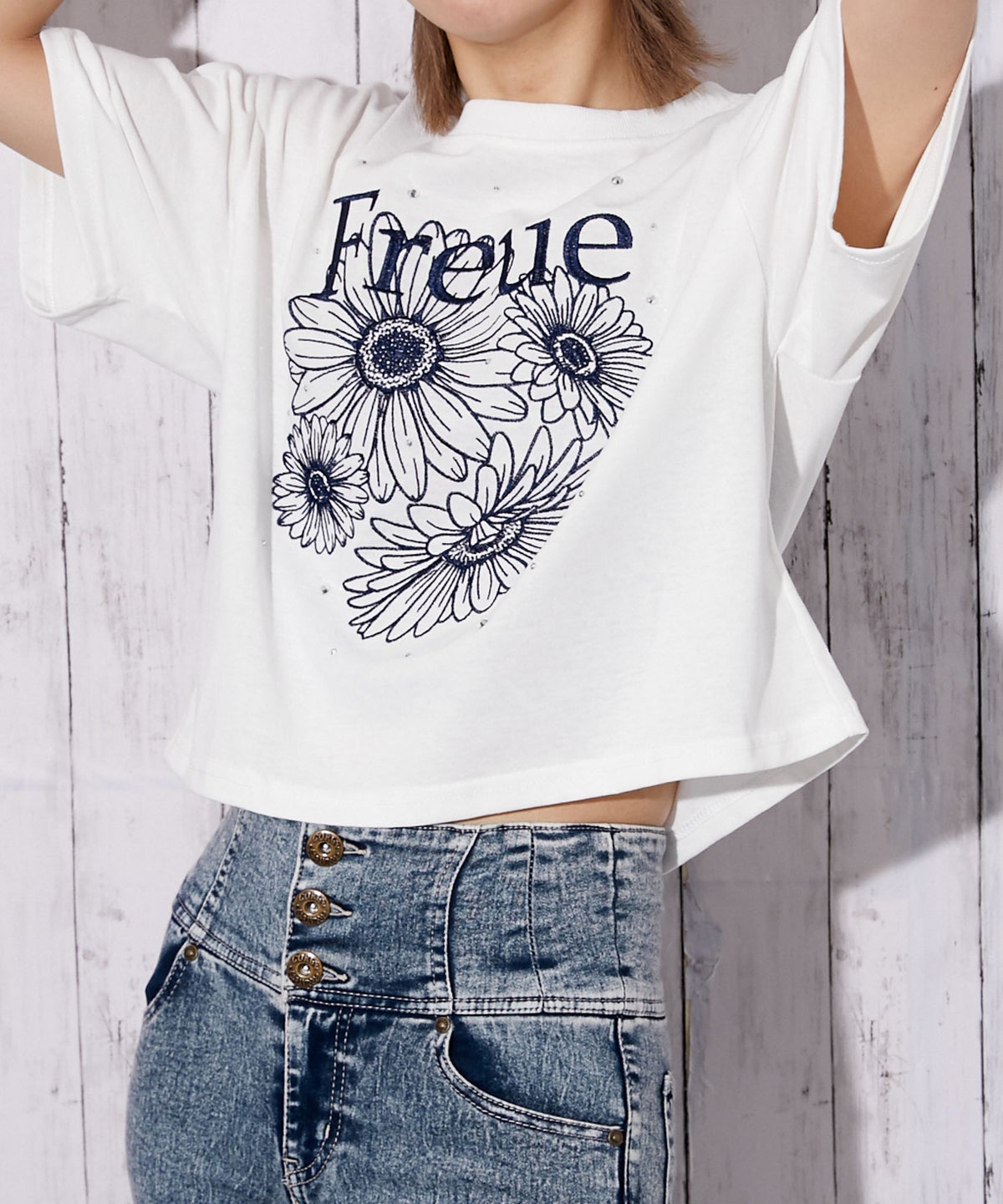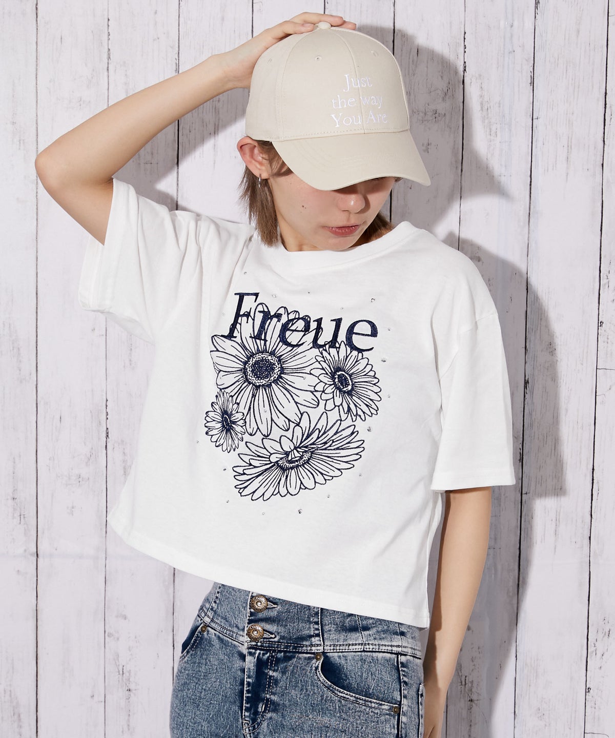 《花柄刺繍×ラインストーン》短丈Tシャツ/Y2K/春夏/全4色