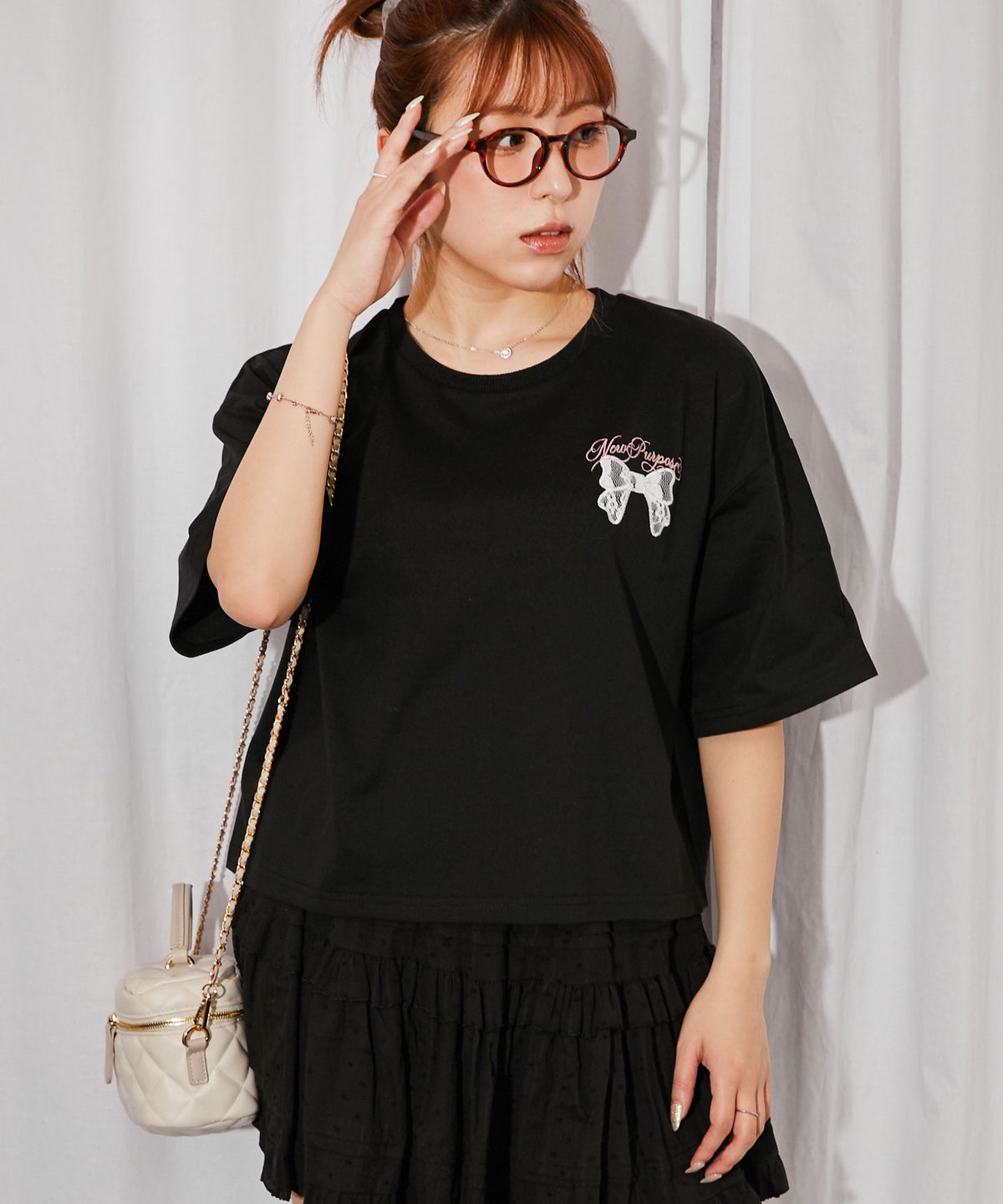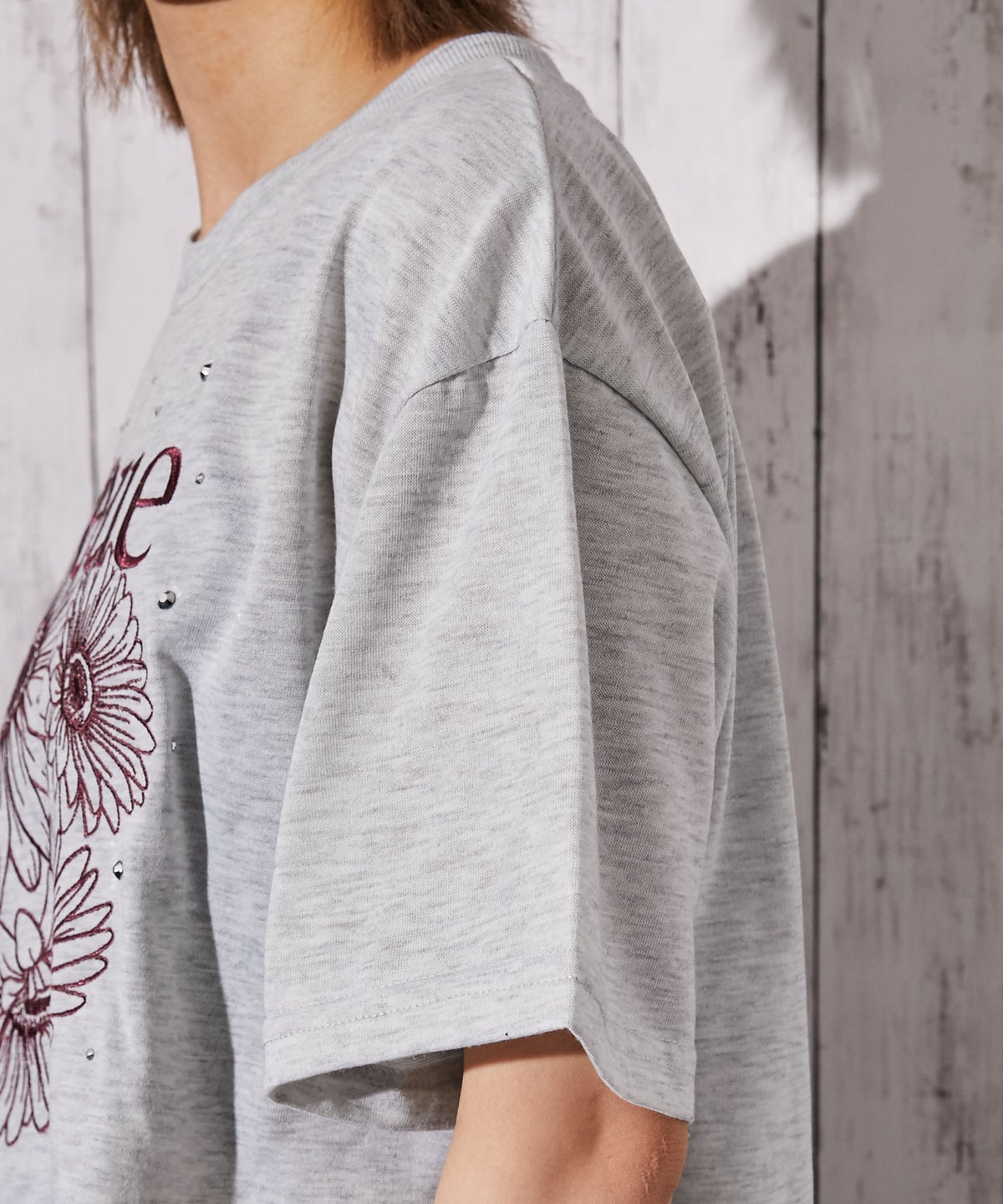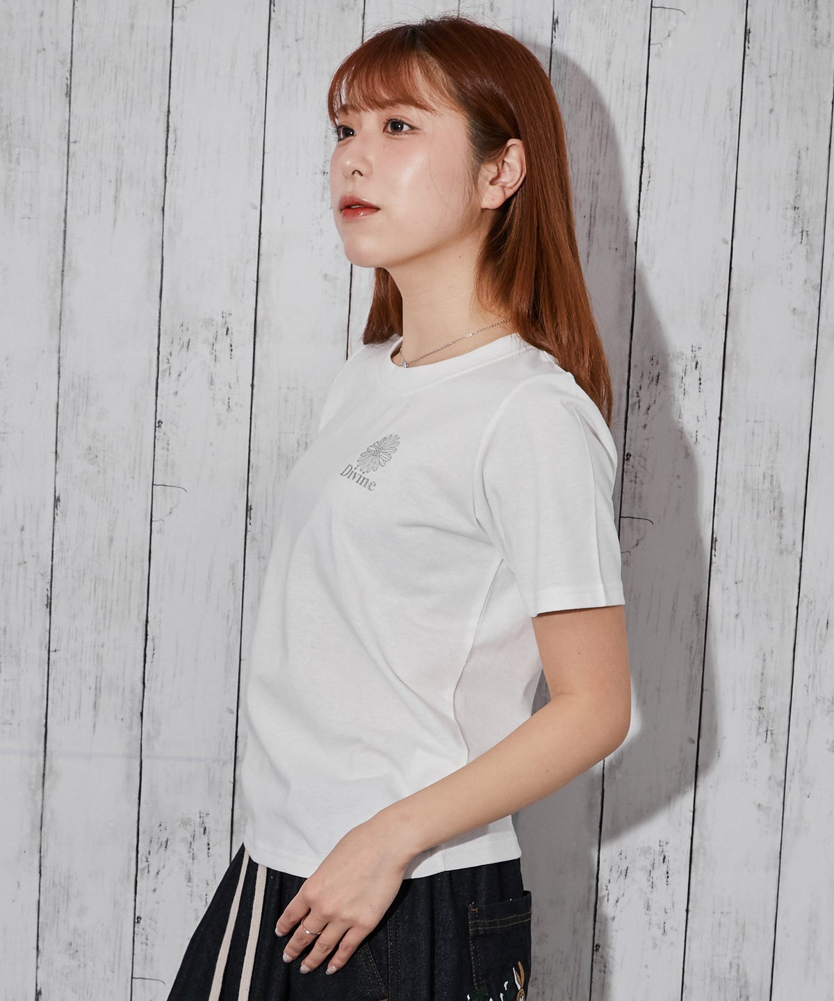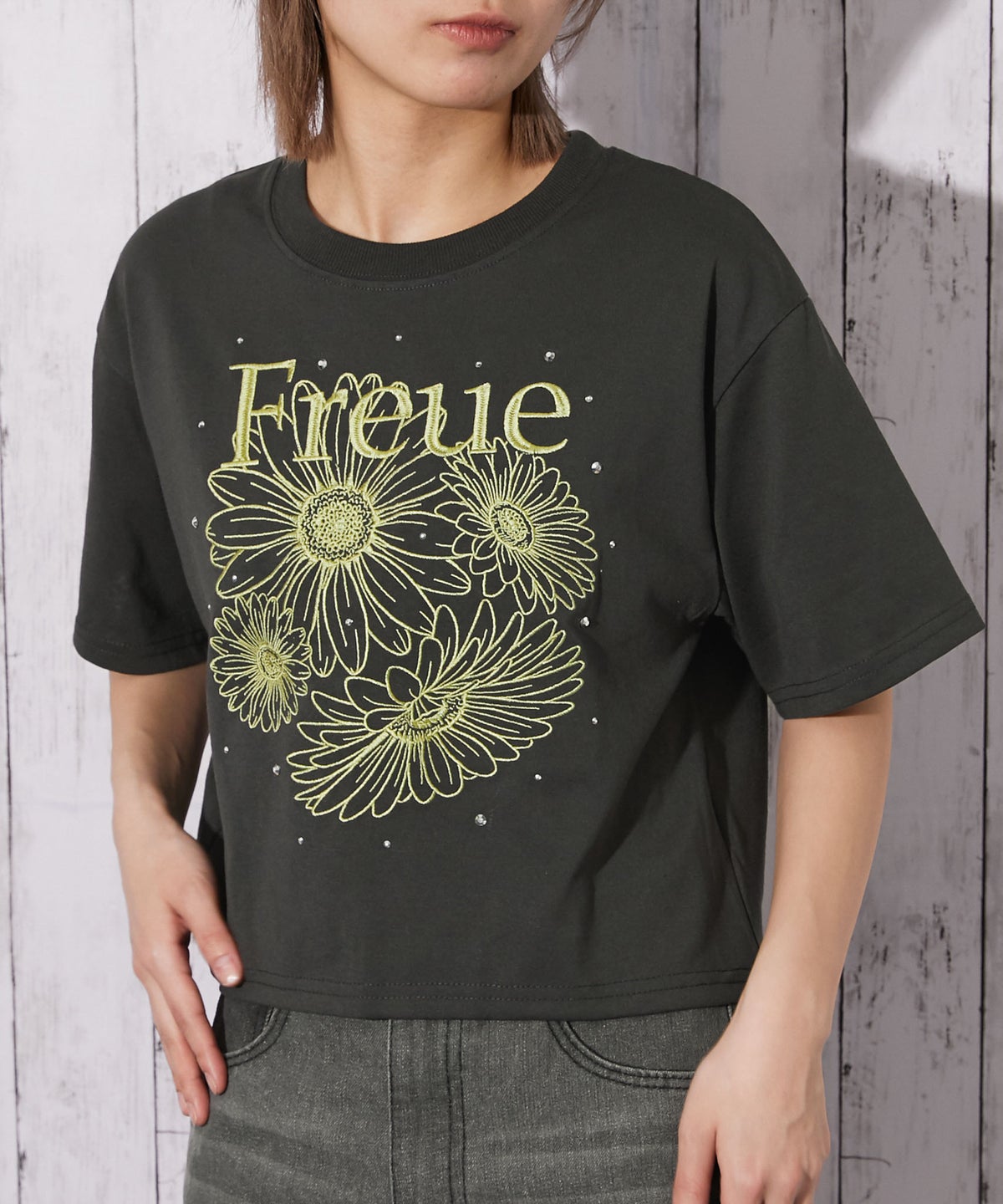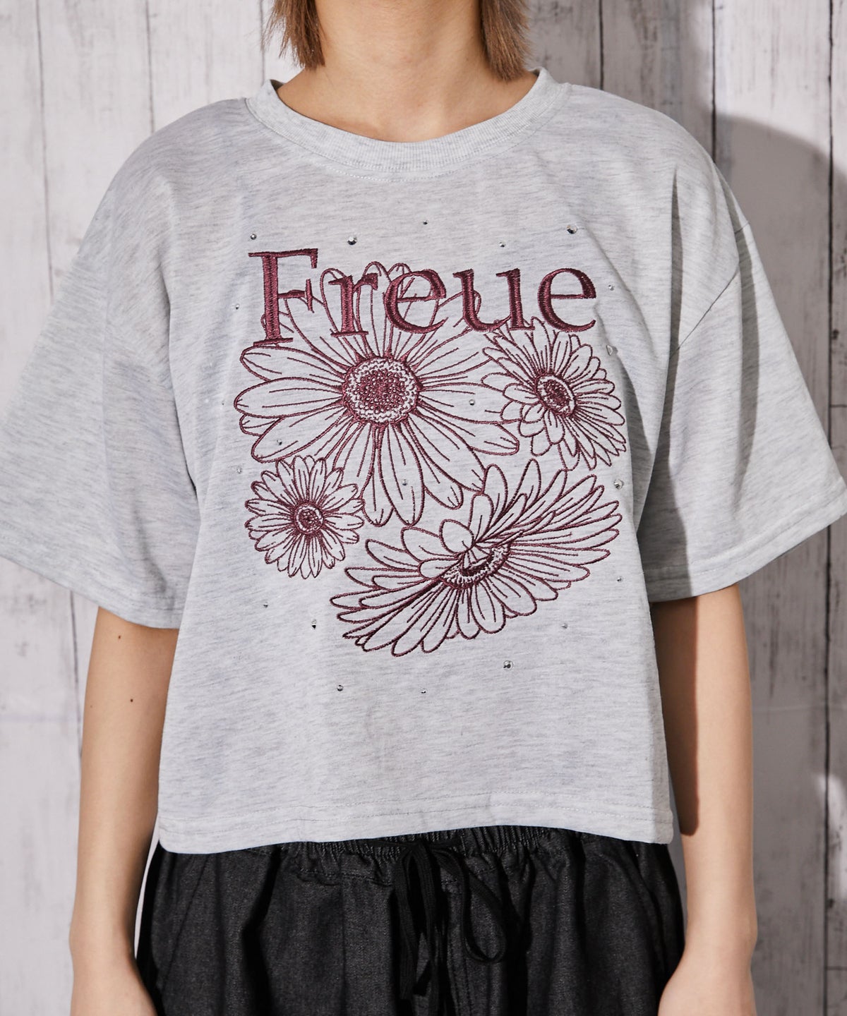 《花柄刺繍×ラインストーン》短丈Tシャツ/Y2K/春夏/全4色