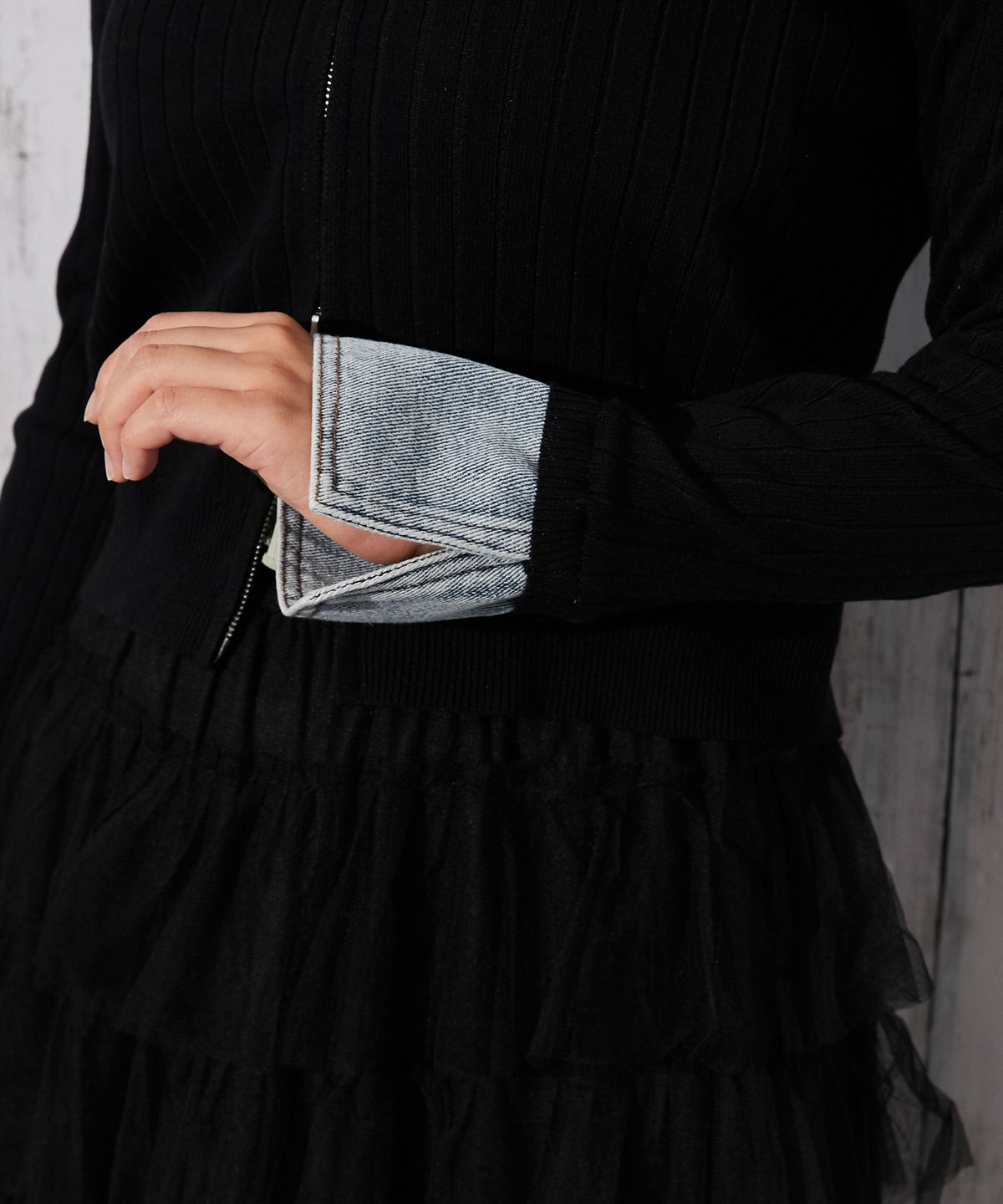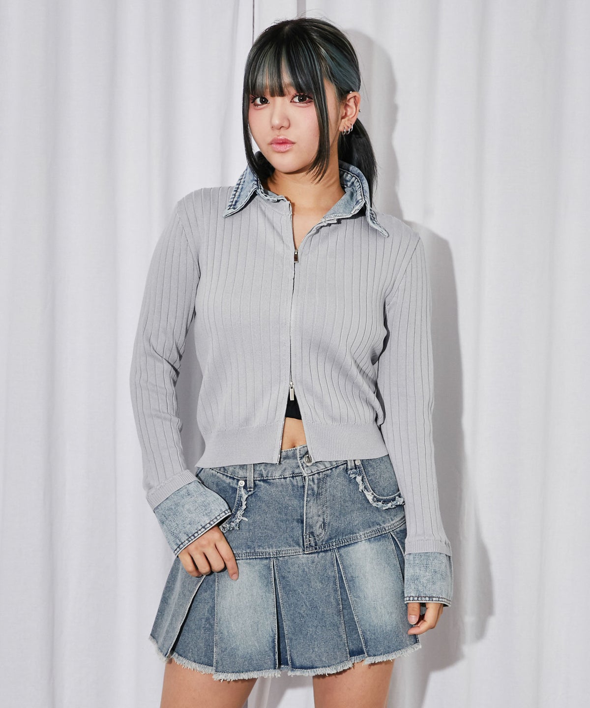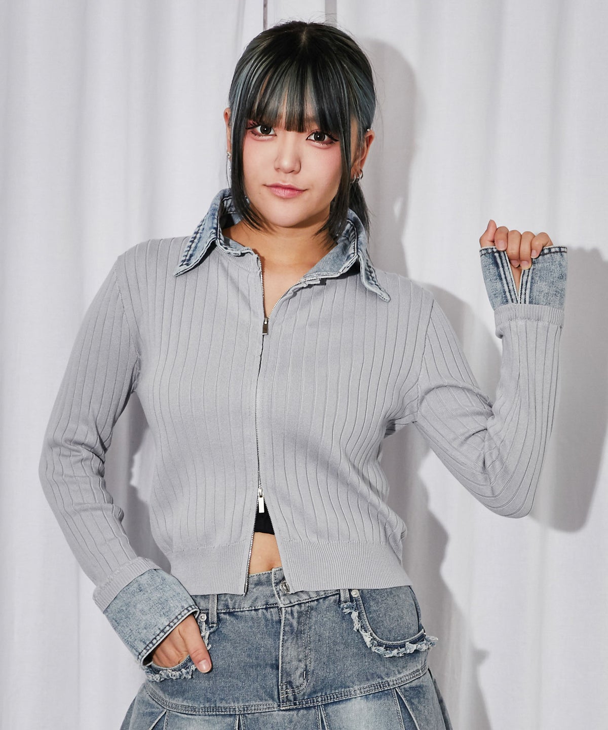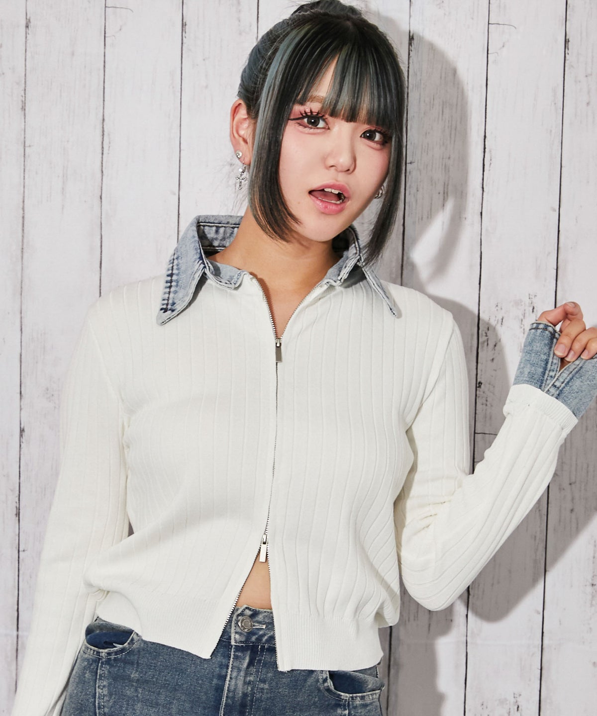 《デニム衿・Wジップ》リブニット/フェミニン/春秋冬/全4色