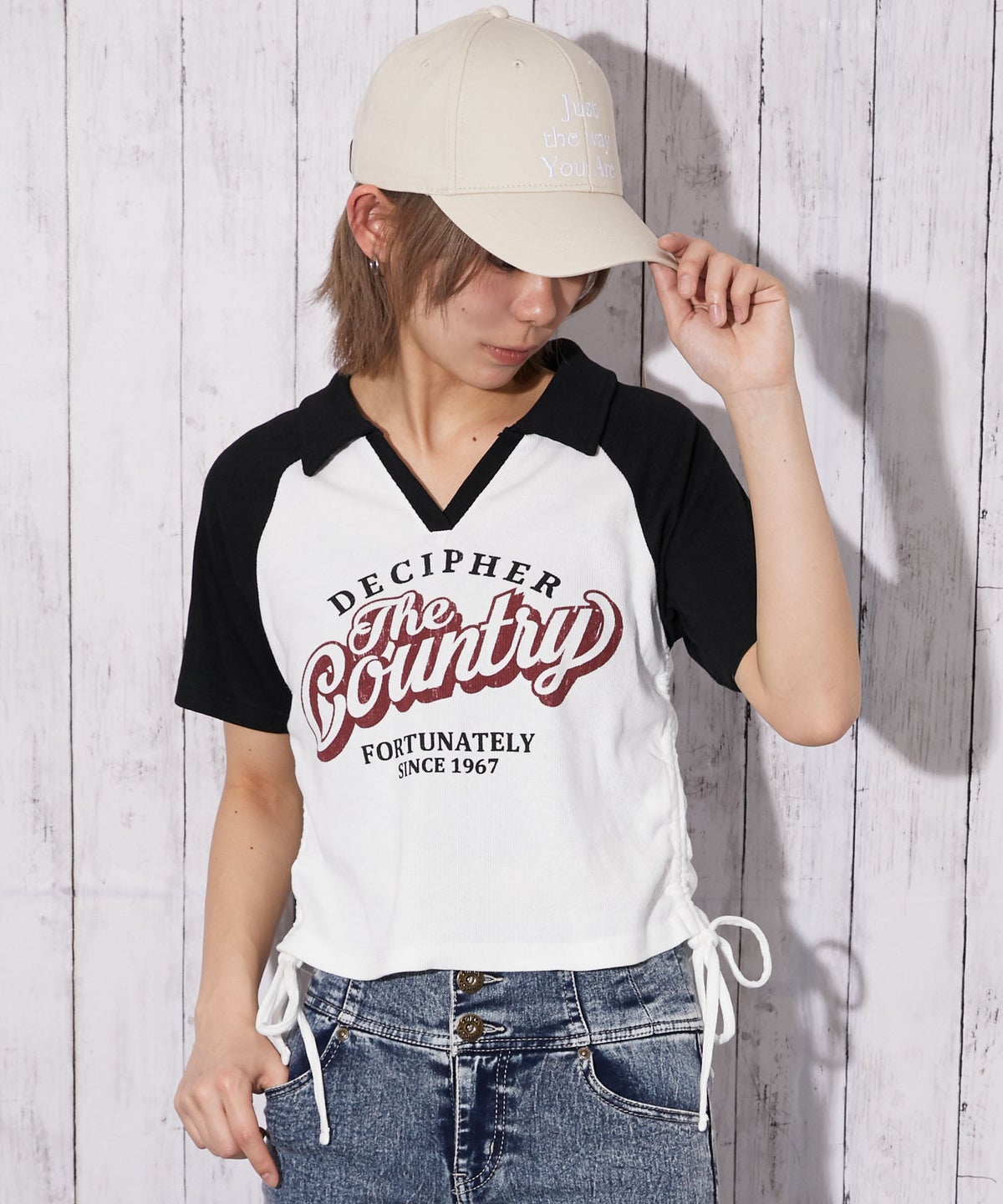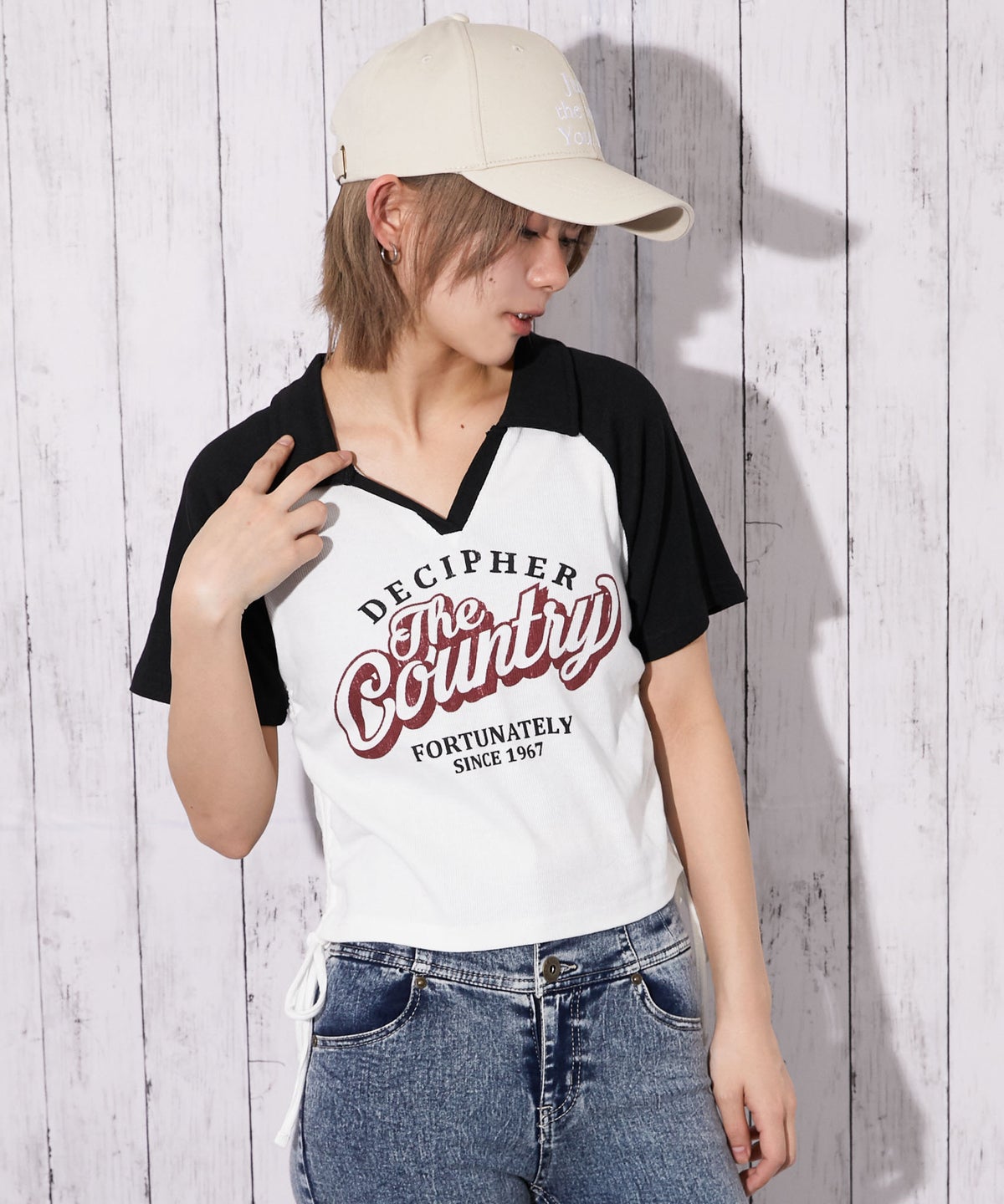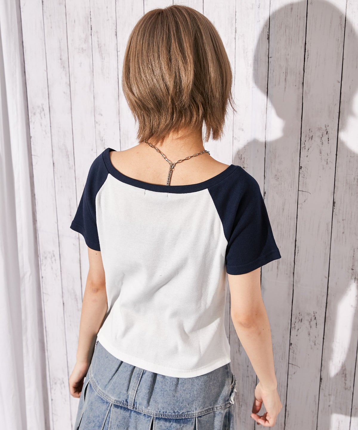 《配色ラグラン×英字ロゴ》スキッパーTシャツ/ストリート/春夏/全2色