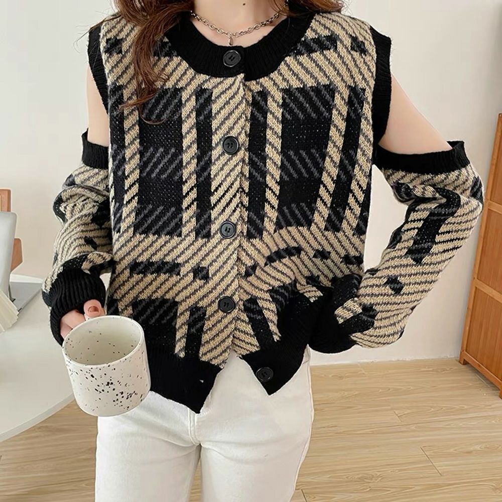 アームウォーマー付き柄ニットプルオーバー